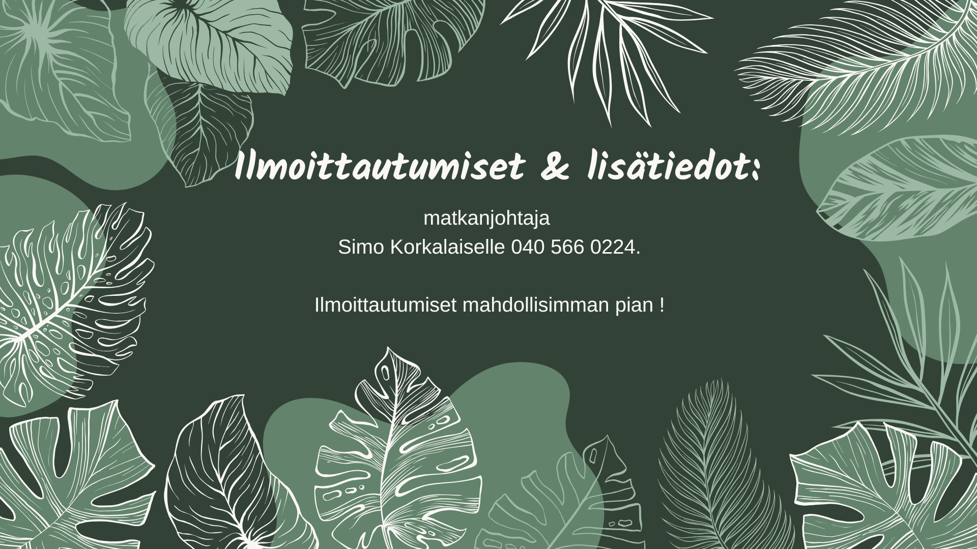 Matkamme ovat ryhmämatkoja ja niihin sovelletaan ryhmämatkaehtojamme. Ehdot saat laskun mukana tai toimistolta pyytämällä.